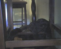 I was cleaning the house this morning and Luna wanted to get away from the vacuum and the broom, so he hid under the table. He made himself very comfortable on the cross bar of one of our chairs there. What a goof ball!!
